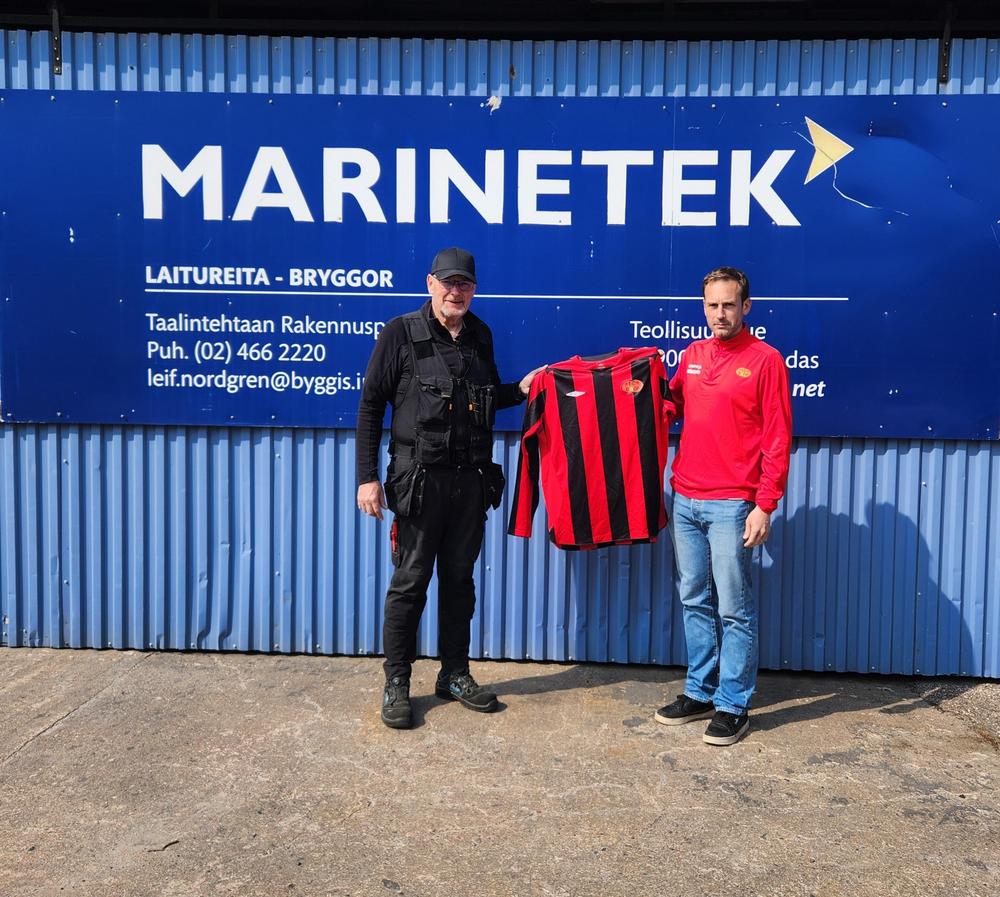 kuva: Albert Lindström ojentaa FC Bodan pelipaidan Michael Nurmelle ( Ilmoituslehden päätoimittaja ja omistaja ).