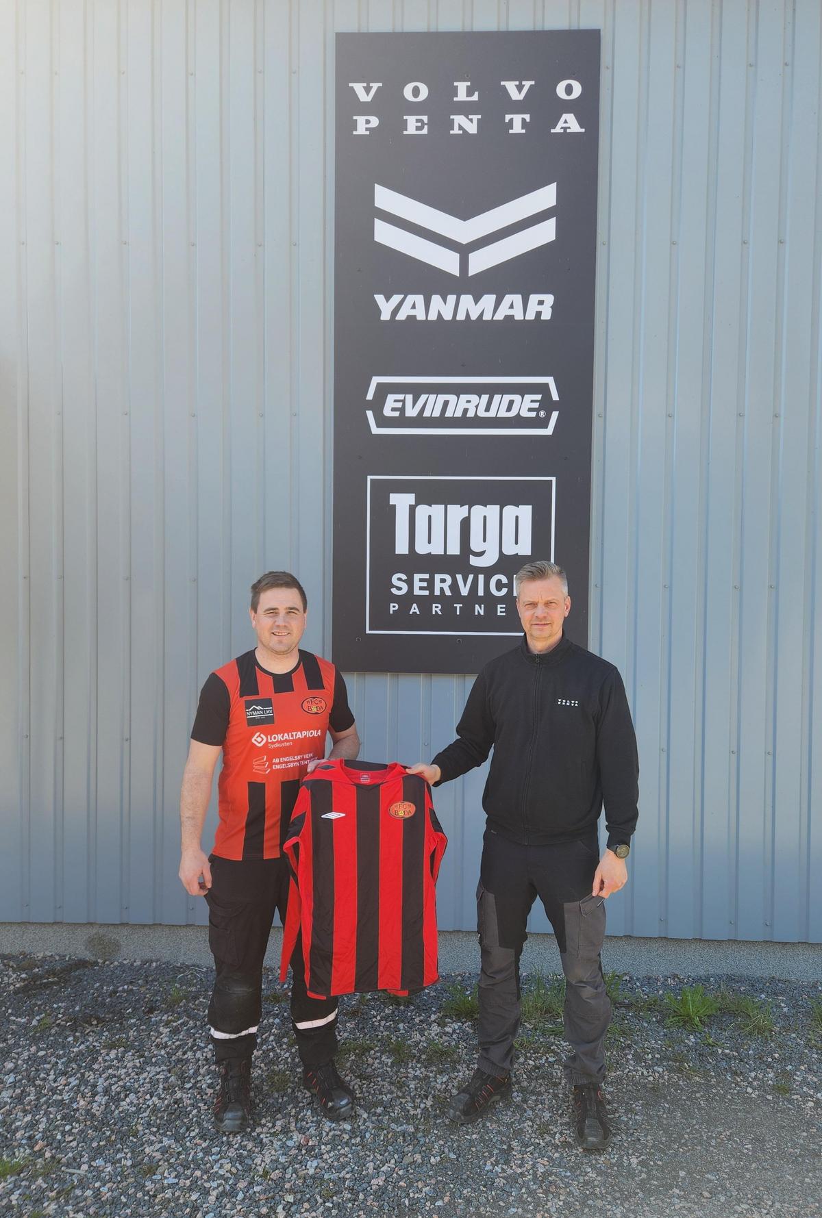 kuva: Albert Lindström ojentaa FC Bodan pelipaidan Michael Nurmelle ( Ilmoituslehden päätoimittaja ja omistaja ).